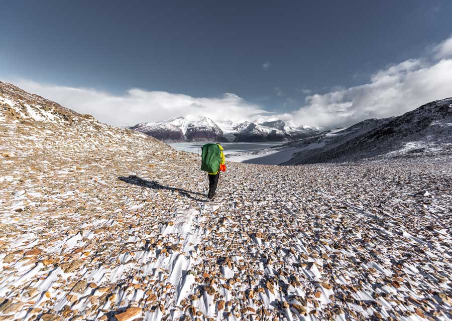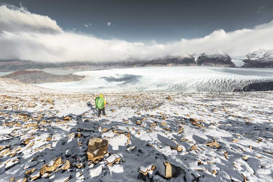 From Bigfoot Basecamp on the northeast shore of Lake Grey, our guides introduce the necessary equipment and give a safety brieng. After carrying the kayaks about 20 meters to the water’s edge, the adventure begins! We paddle among oating icebergs and towards the eastern face of Grey Glacier, marveling at the stunning scenery. In the afternoon, we trek across a high plateau overlooking Lake Grey and its icebergs, making our way to Lake Pehoé —“hidden lake” in the Tehuelche language. We will expend the night at Lodge Paine Grande, where dinner and lodging await. Enjoy a well deserved pisco sour while taking in sunset views of Paine Grande and Los Cuernos. (B/L/D)