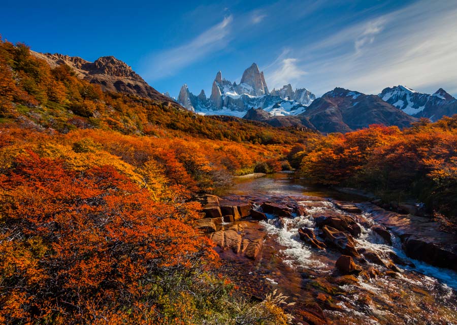 After a full breakfast at our private dome, we begin the second day’s trek, leaving the Fitz Roy massif behind as we head towards the valley of Lake Mother and Daughter, with Cerro Torre as our nal destination. Along the trail, we’ll stop at scenic lakes for photos and, with some luck, spot a colony of Patagonian geese. Continuing through lenga and ñire forests, we cross an old moraine to reach Lake Torre and the impressive Grande Glacier. If weather permits, we’ll hike further to the Maestri viewpoint for an even closer look at the glacier. After completing the circuit, we return to El Chaltén via the Fitz Roy River valley, stopping at the classic viewpoint and the beautiful Margarita waterfall. (B/L)